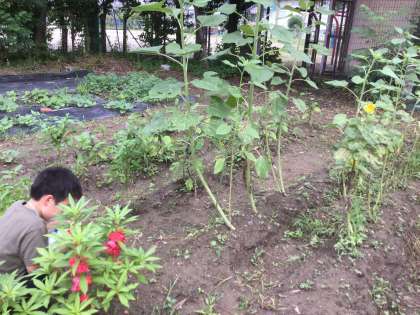 4月に種を植えてから約3か月,みるみる大きくなってきたホウセンカにいよいよ花が咲きました。とてもきれいな色の花に子どもたちもうっとり。隣を見ると自分たちの身長よりも大きくなったひまわりが!よ〜く見るとひまわりももうすぐ花が咲きそうです!
