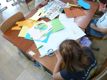 1年生の図工は「おって たてたら」です。いろいろな大きさや色、形の紙を並べてどんなものができそうか想像を膨らませています。