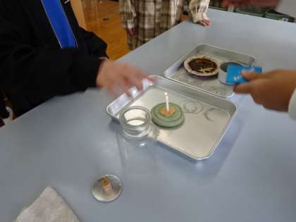 理科の実験がありました。初めてマッチで火をつけ,瓶にいれるという活動を行いました。初めての経験で少し緊張している様子もありましたが,怪我なく安全に取り組むことができました。