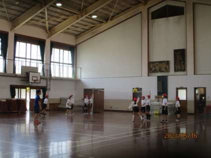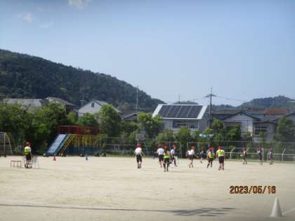 午後の校内の様子です。体育科の学習で4年生は「ソフトバレーボール」、6年生は「タグラグビー」に取り組んでいました。
