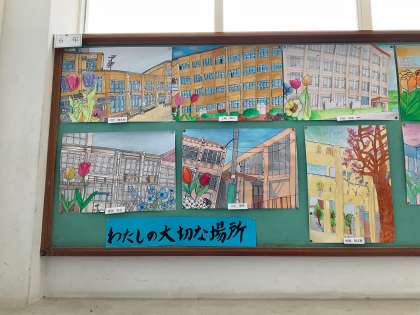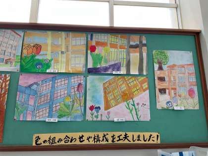 お気に入りの花と学校を表現しました。細かく描いたり、水彩絵の具で色の組み合わせを工夫したりしました。