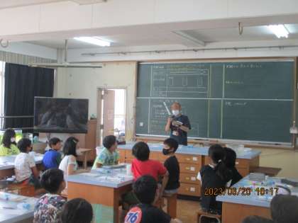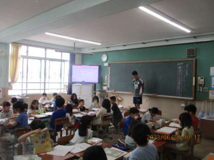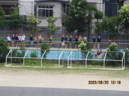 国語科や理科の学習に取り組むクラスもありました。プールのほうをみると、高学年が水泳の学習をしていました。
