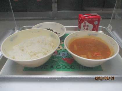 本日の献立は、ごはん、牛乳、ポークカレー、ひじきのソテーでした。