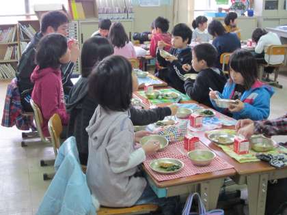 3年生が配膳台の用意、4,5年生が給食当番をするなど、
