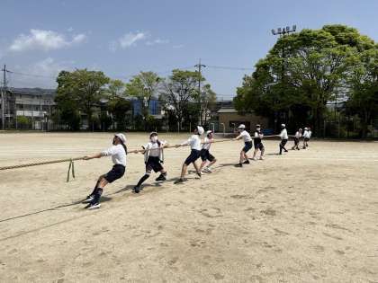 体育の最初の学習は、総合遊具の正しい使い方をみんなで確認してから、体ほぐしとして、綱引きをしました。並びや声かけをチームで工夫していました。