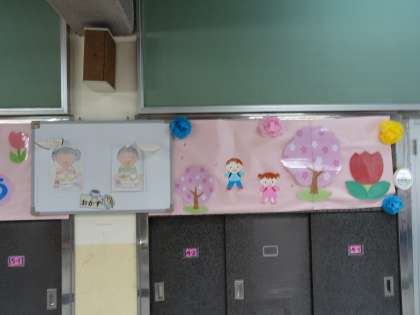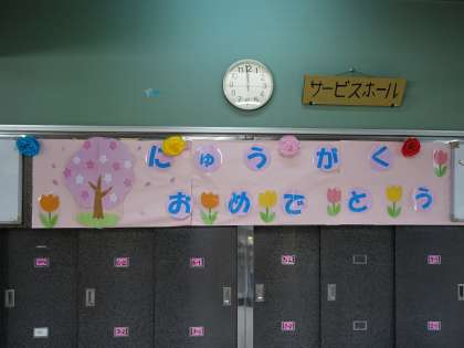 給食室サービスホールです。入学を祝う掲示物でいっぱいです。