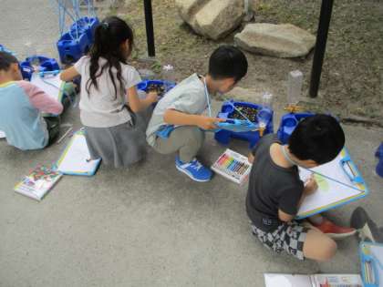 1年生が大切に育てているアサガオが芽を出しました。今日は、かわいい芽の様子を観察しました。特徴を捉えて、上手にスケッチしています。