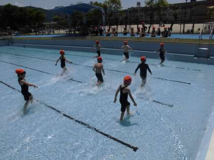 いよいよプールでの学習が始まりました。今日は、プールでの基本的なルールを確かめたり、水慣れのための運動を行ったりしました。