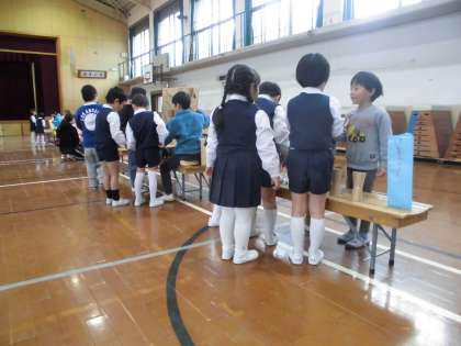 1年生は、洛東幼稚園の年長さんをお迎えして、秋見つけで探してきたどんぐりや落ち葉を使って「おみせやさん」をしました。年長さんに優しく話しかける様子は、すっかりお兄さん・お姉さんでした。