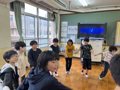 「楽しそうな歌!」「楽しそうに歌うにはどうしたらいいかな?」という子どもたちの話から、みんなで輪になって手をつないで歌ってみました。とても楽しそうにしていました。