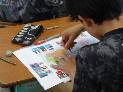 世界の主な大陸や海洋と日本の位置や国旗について調べました。