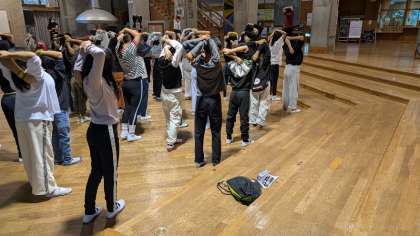 オリエンテーリングホールで朝のつどいを行いました。