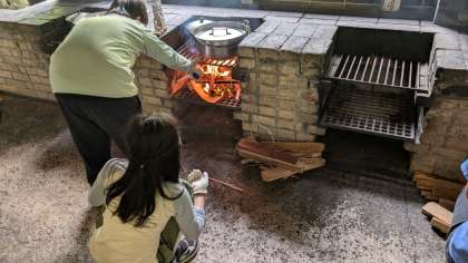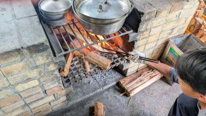 かまどの火を絶やさないように、薪をくべました。