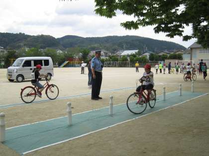 今年も35名の4年生が、山科署の方・地域の方・PTAの方に教えてもらったり、見守ってもらったりして、自転車の安全な乗り方・走り方を学習しました。