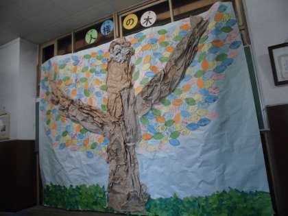 職員室の前に「人権の木」が飾ってあります。仲間を大切にするために自分には何ができるのか、子どもたちが考えたことが葉に書いてあります。人権月間や「ぽかぽか参観」など人権について考える際に、自分が書いたことを思い出してもらいたいです。