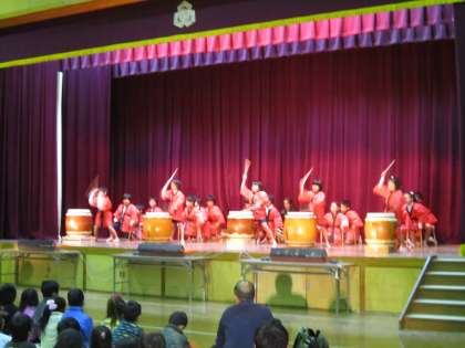 きりりとしたはっぴ姿で、リズムにのった和太鼓の演奏を聞かせてくれました。手を大きく振り上げ、ドンと打ち鳴らす和太鼓からは、力強い音がうみだされ、心にまで響いてきました。