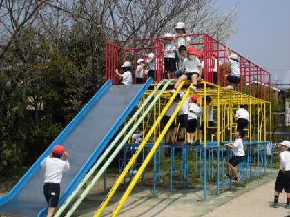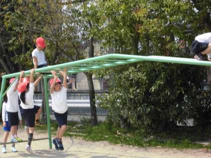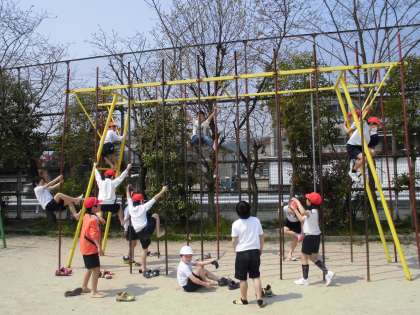 3年生になって初めての体育。春休み中に体をどれだけ動かしていたか心配だったので遊具を使って体を動かしました。3年生からは,休み時間に自由に総合遊具を使ってもいいということで,みんな大はしゃぎでした。