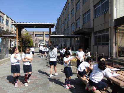 はじめの単元は「季節の生き物(春)」ということで、学校の中庭・ビオトープにて、春を感じられるものをみんなで探しました。