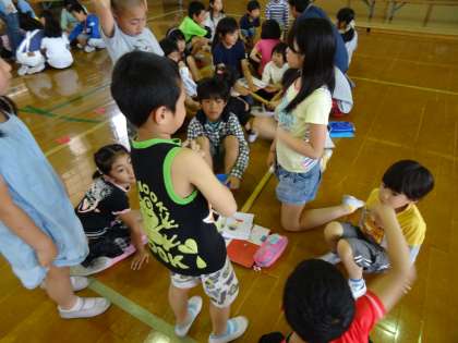 少し緊張しながら1年生は舞台に座り,会が始まりました。全校のみんなで「校歌」や「はじめの一歩」の歌を歌ったり,縦割りグループに分かれて自己紹介をしたり遊んだりして,ほのぼのとした会になりました。