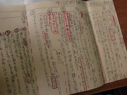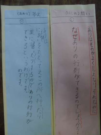 3年生の国語の説明文教材です。3年生では「はじめ・中・終り」を意識して書いたり,読んだり,話したりできるようになることを目指しています。「はじめ」と「終わり」はすぐわかるのですが,「中」の部分「どのような順番で」というあたりがむずかしかったかな?丁寧に読むことが大事ですね。