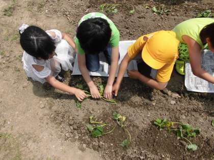 しばらく時間がたつと,園児さん達ともすっかり打ち解け,なかよく植える姿が見られました。