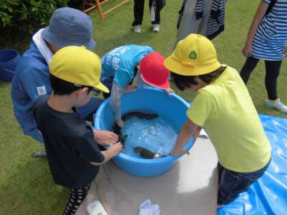 大きななまずとライ魚にびっくりしていました。さわった感触の違いにびっくりしていました。