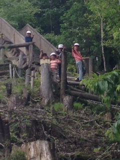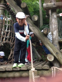 雲行きが怪しくなってきたので、野外炊事の後片付けを中断して、楽しみにしている、『冒険の森アスレチック』をスタートさせました。