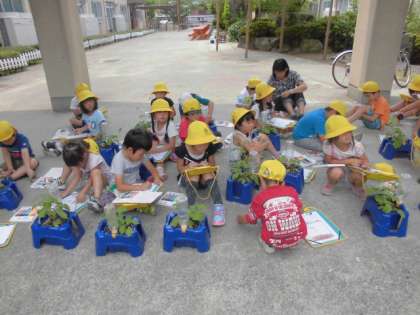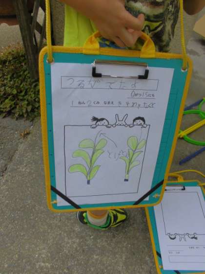 毎日欠かさず水やりをやってきたおかげで、「あさがお」のツルもずいぶんと長くのびてきました。今日は、成長の様子を用紙に書きうつし、色付けをしました。また、伸び続けるツルをからませるために、鉢植えに支柱を取り付けました。