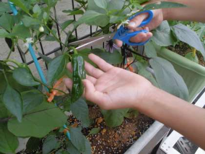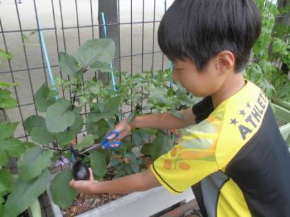 ワンダフルワールドで栽培している「山科なす」と「山科とうがらし」が順調に育ってきました。中間休みに、水やり当番の美化・環境委員が大きくなった「なす」と「とうがらし」をハサミで丁寧に収穫しました。これからまだまだ実が育っていきます。