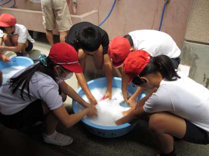 22日(月)の3・4校時,家庭科の「工夫しよう さわやかな生活」で手洗いの実習をしました。それまで履いていた自分の靴下を洗いました。色の変わった洗剤の液を見て,「こんなに靴下が汚れてたんや。」と言いながら,一生懸命手洗いをしていました。