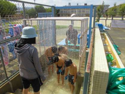 天候にも恵まれ本日から「水慣れ週間」が始まりました。本年度、最初にプールに入るのは2年生とつくしです。準備体操⇒決まりごとの確認⇒シャワー・・・そして、いよいよプールサイドへ。みんな気持ちがワクワク高ぶっています。