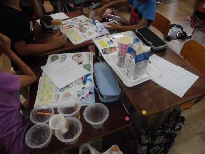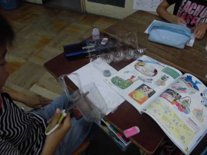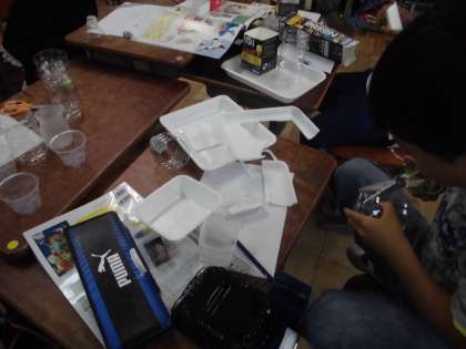 工作の単元で「ハッピー小物入れ」を始めました。お家から持ってきたトレーやプリンカップなどを組み合わせて,その上から色の紙粘土をつけていきます。
