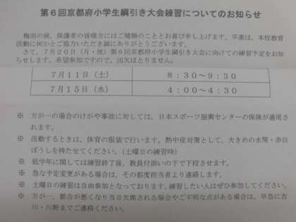 7月20日(祝)に迫ってきました「第6回京都府小学生綱引き大会」の練習を以下の曜日に実施します。特に、チーム単位での参加になりますので、積極的な練習参加と欠席の場合は先生への連絡の徹底など、参加されるご家庭につきましては、お子達への確認をよろしくお願いいたします。