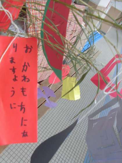 スイカをはじめ折り紙を器用に折りたたんだり、ハサミで複雑な模様に切った飾りがたくさん笹の葉に結ばれて、とてもきれいです。また、色とりどりの短冊には、星への願い事をしっかりと書いてくれています。