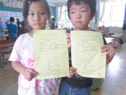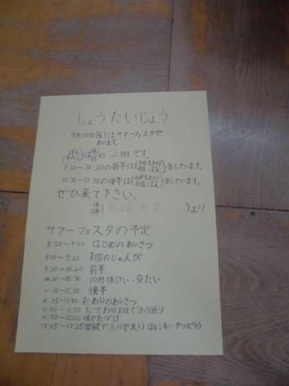 今日は、給食を食べ終わるとすぐに『なかよしタイム』でした。明後日に開催される「西野サマーフェスタ」のリハーサルです。1・2年生は上級生が作ってくれた招待状をもらい、家庭に持って帰ることになっています。