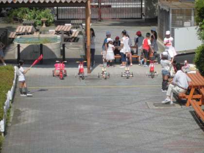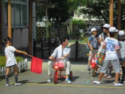炎天下、先生が身をかがめて三輪車に悪戦苦闘!