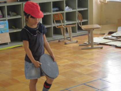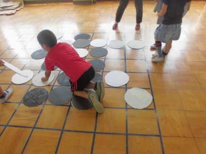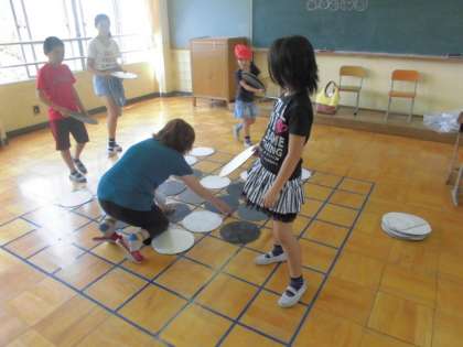 教室の床の目を利用してます。1つ1つのオセロも段ボールの手作りですよ。