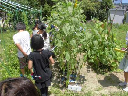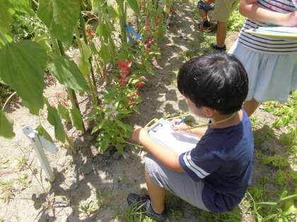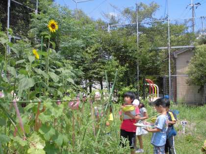 今日は理科の授業でヒマワリとホウセンカを観察しました。自分たちの背よりも高いヒマワリを見上げて、「すごい!」と声を上げていました。