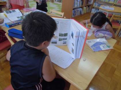 自分たちが調べたいものがなかなか見つからず,悪戦苦闘していたようすですが,本の分類表などを活用して探していました。