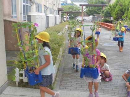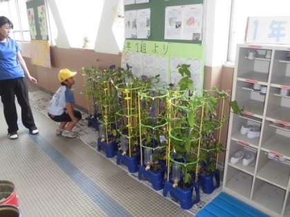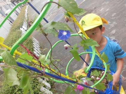 明日にでも接近するであろう台風11号の影響で、時折、強い風が吹いています。中庭で栽培している「アサガオ」のプランターを校舎の中に避難させました。