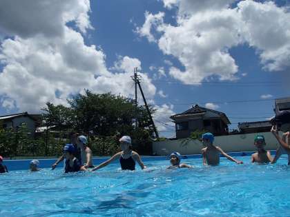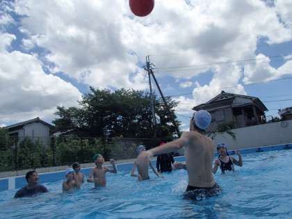 快晴の中,中学生4名 小学生4名が集まり,プール交流をしました。中学生と小学生がバディを組み手を引っ張ってもらって泳いだり,じゃんけんをしてもぐったりしました。そのあと鬼ごっこをしました。「キャーキャー」という歓声があがり,みんなとても楽しんでいるようでした。最後は,風船バレーをして楽しみました。次の交流である「カフェ」がとても楽しみになりました。