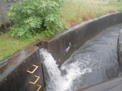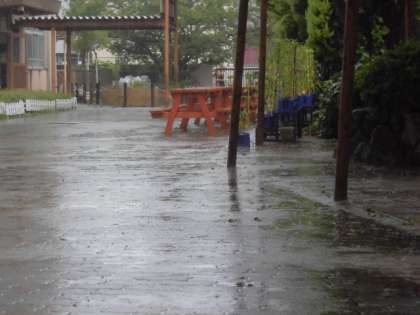 中庭には大きな水たまり、通学路沿いの野色川も濁流が流れていました。