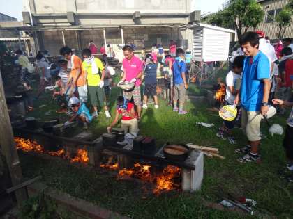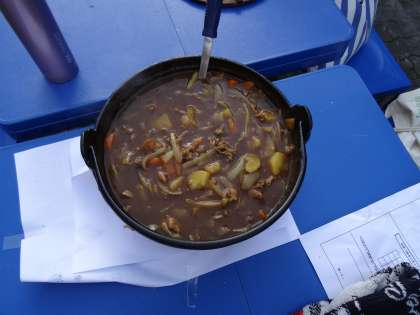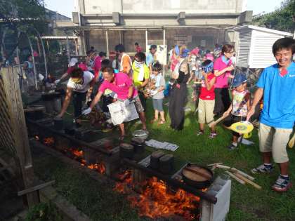 かまどの火もしっかりと燃え上がり、いよいよ、飯盒とカレー食材の入った鉄なべを火にかけます。