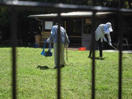 ワンダフルワールドでは、週末の行事と月末の運動会に向けて、用務員さんと教頭先生できれいに芝生の剪定と雑草の処理を行いました。