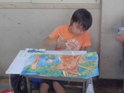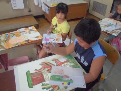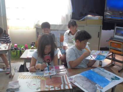 今日の3,4時間目はお話の絵を描きました。水彩絵の具やコンテ,クレパスなど様々な道具を使って表現しています。みんな真剣に絵に向かっていました。