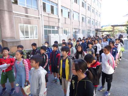 西野小学校の6年生も昼食後、中庭に集まり、やや緊張した表情で中学校へ出発しました。体育館に入ると中学校の先生方にも出迎えられ、司会を務める人は、より一層、緊張しているようです。
