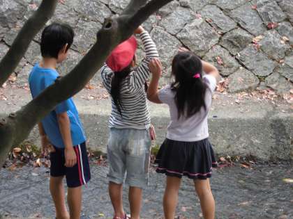 石の下や川の淵からカニや小さな生き物を見つけるたびに「キャー」「ワァ〜」「すごい」と歓声が上がってました!