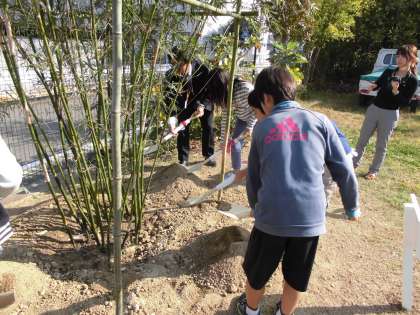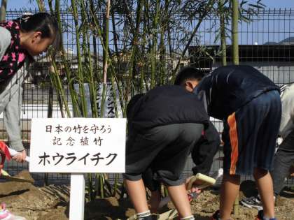 5時間目、6年生は「竹文化振興協会」から寄贈された「ホウライチク」という品種の竹株をワンダフルワールドに植竹しました。