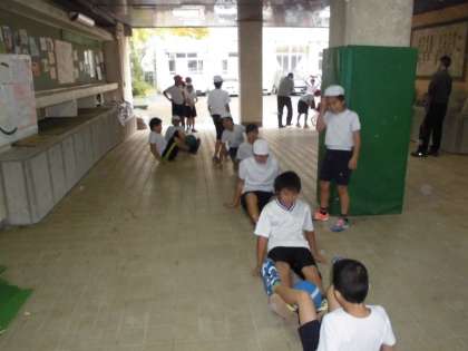 いつもは運動場での活動ですが、今日はあいにくの空模様。