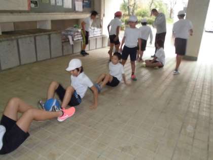 少し場所が狭いようですが、ピロティーに集合してグループに分かれボールを使ったトレーニングをしていました。